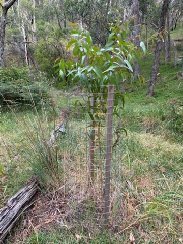Natural regeneration is the ultimate goal of all bushcare and so in areas where it is sparse and slow every self sown seedling is valuable. In 2024 with the assistance of our ranger and a generous donation Paul experimented with putting strong wire mesh guards on some seedlings coming up in otherwise bare or degraded ground to prevent grazing by kangaroos and rabbits. This has been remarkably successful in many cases with some of the seedlings growing from just a few inches tall to now reaching halfway up their guards and some eucalypts growing out of the top. At what point do we remove and reuse the guards is a question we will have to consider.